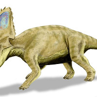 목에 있는 주름장식에서 6개의 긴 가시돌기가 돋아나 있고 그 가장자리에는 더 짧은 가시가 돋아나 있었습니다. 코 위에는 긴 뿔이 하나 솟아 있는데 공격자에 대한 무기로 사용한 것으로 보입니다.