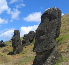 이스터 섬의 거석상, 모아이(Moai) 망망대해인 태평양의 한가운데에 떠 있는 이스터섬은 '모아이'라고 하는 거석상으로 인해 상당한 관심을 불러일으키는 곳이다. 이스터섬은 타이티 섬에서 4,000km, 하와이에서 8,000km, 호주에서 9,000km, 1888년부터 귀속된 칠레로부터 3,700km 떨어진 곳에 위치하고 있다. 원주민들은 이 섬을 '라파누이(큰 섬)'라 부르고 있으며, 옛날 폴리네시아인들이 최초로 이 섬을 발견했을 때는 '테 피토 테 헤누아(지구의 배꼽)'라 했다. 이 섬에서 다리가 없고 몸통만 있는 머리는 아주 크며 귀도 상당히 긴 그런 괴상한 모습의 거석상들이 약 1000여개 가량 발견되었다. 이 거석상을 '모아이(moai)'라고 한다. 키는 3.5 ~ 5.5m에 달하고 무게가 20톤..